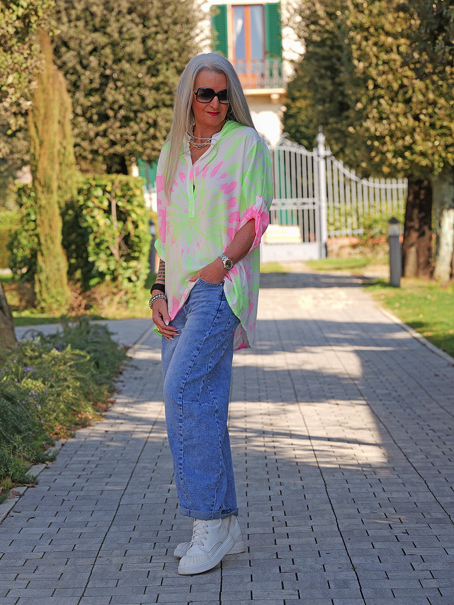 Unsere Bluse Batic ist ein echtes Highlight für alle, die Farbe lieben und dabei nicht auf Eleganz verzichten möchten. Das ausdrucksstarke Batik-Muster in leuchtendem Neon Pink und frischem Lime sorgt für sofortige Frühlings- und Sommergefühle.