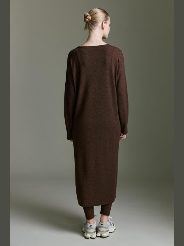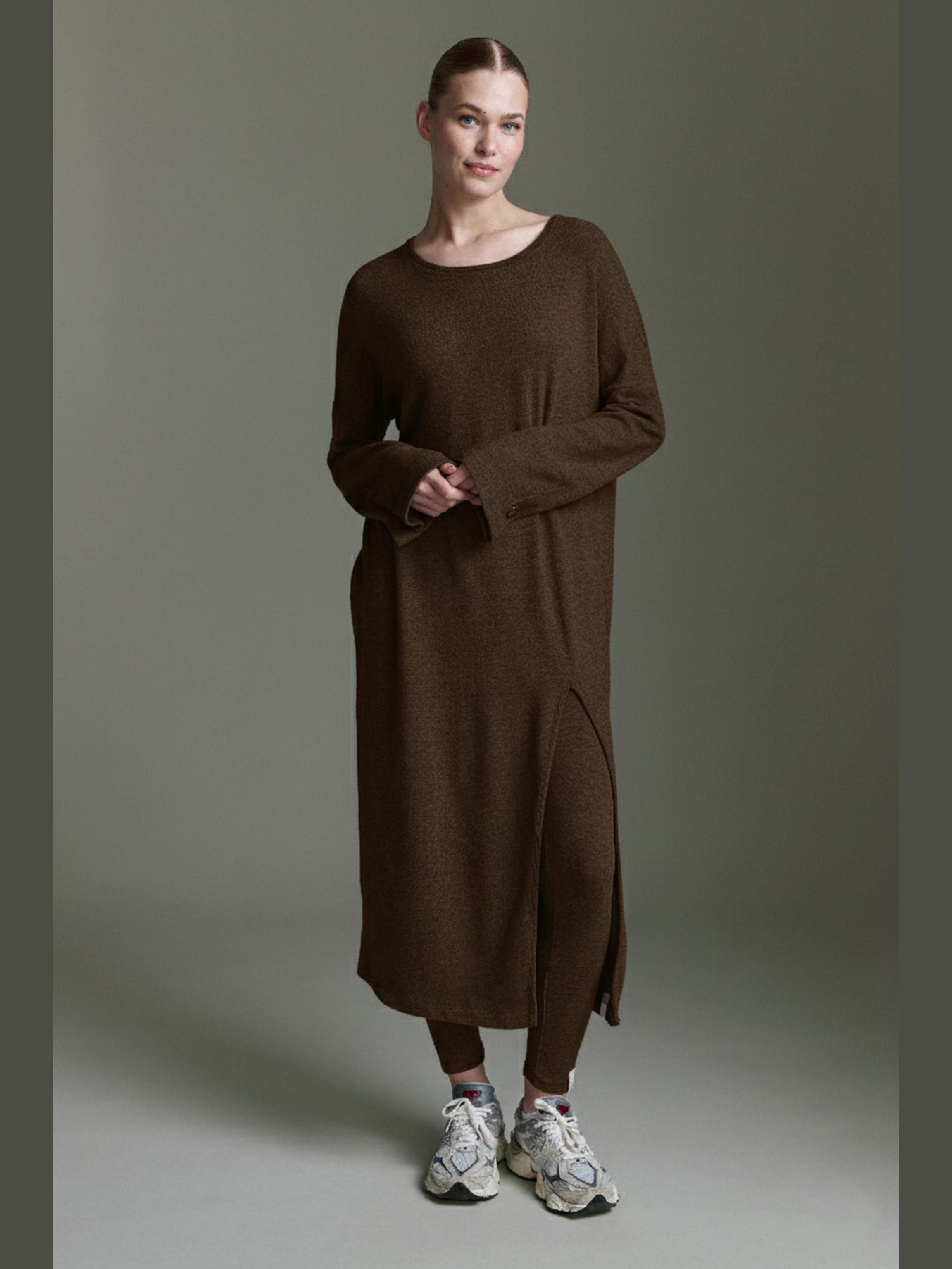 Dieses locker geschnittene Langarmkleid kombiniert minimalistisches Design mit maximalem Komfort. Der weite, gerade Schnitt sorgt für eine entspannte Silhouette und lässt sich vielseitig stylen – sowohl casual im Alltag als auch modern und elegant kombiniert.Ein besonderes Detail ist der seitliche Schlitz, der dem Look Leichtigkeit verleiht und für mehr Bewegungsfreiheit sorgt. Der weite Rundhalsausschnitt und die langen Ärmel mit dekorativem Knopfdetail unterstreichen den cleanen, modernen Stil des Kleids.