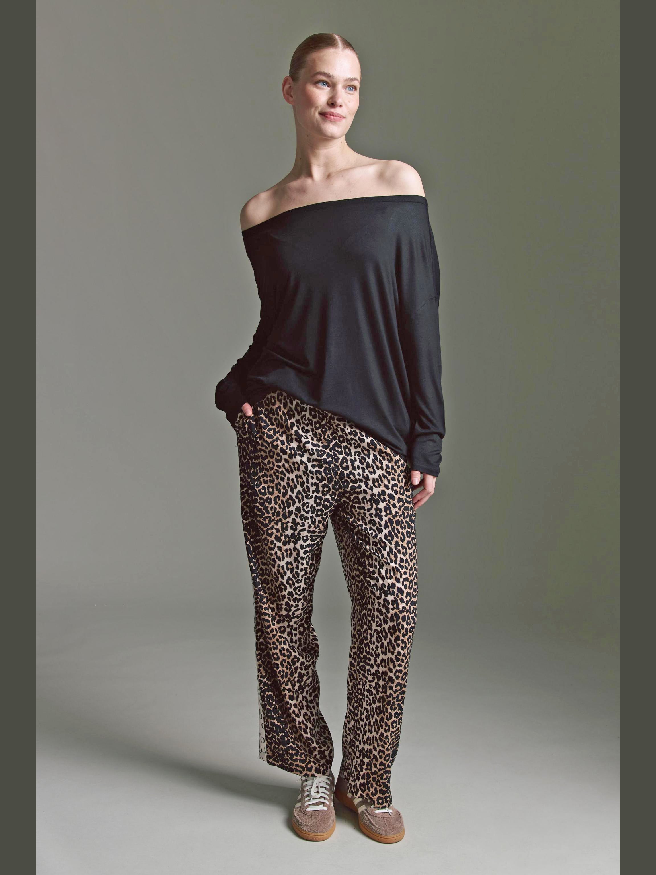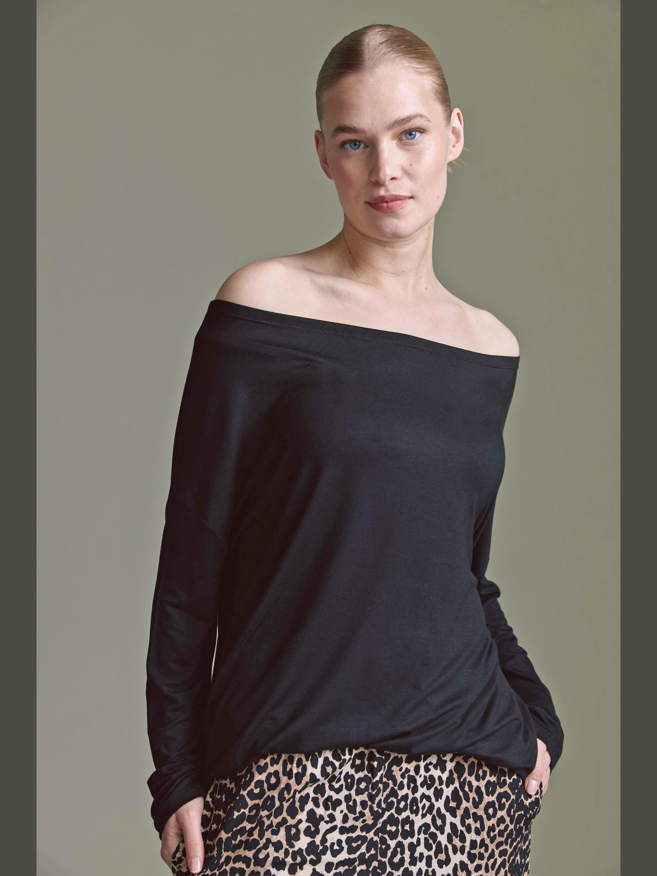 Dieses Langarmshirt besticht durch seinen femininen Off-Shoulder-Ausschnitt, der die Schultern gekonnt in Szene setzt und dem Look eine subtile Eleganz verleiht. Die weiche, fließende Materialqualität sorgt für ein angenehmes Tragegefühl und einen schönen Fall. Mit seinem lockeren Schnitt und langen Ärmeln lässt sich das Modell sowohl leger als auch stilvoll kombinieren – perfekt zu Jeans oder gemusterten Hosen. Ein vielseitiges Essential, das schlichte Raffinesse mit modischer Lässigkeit vereint.