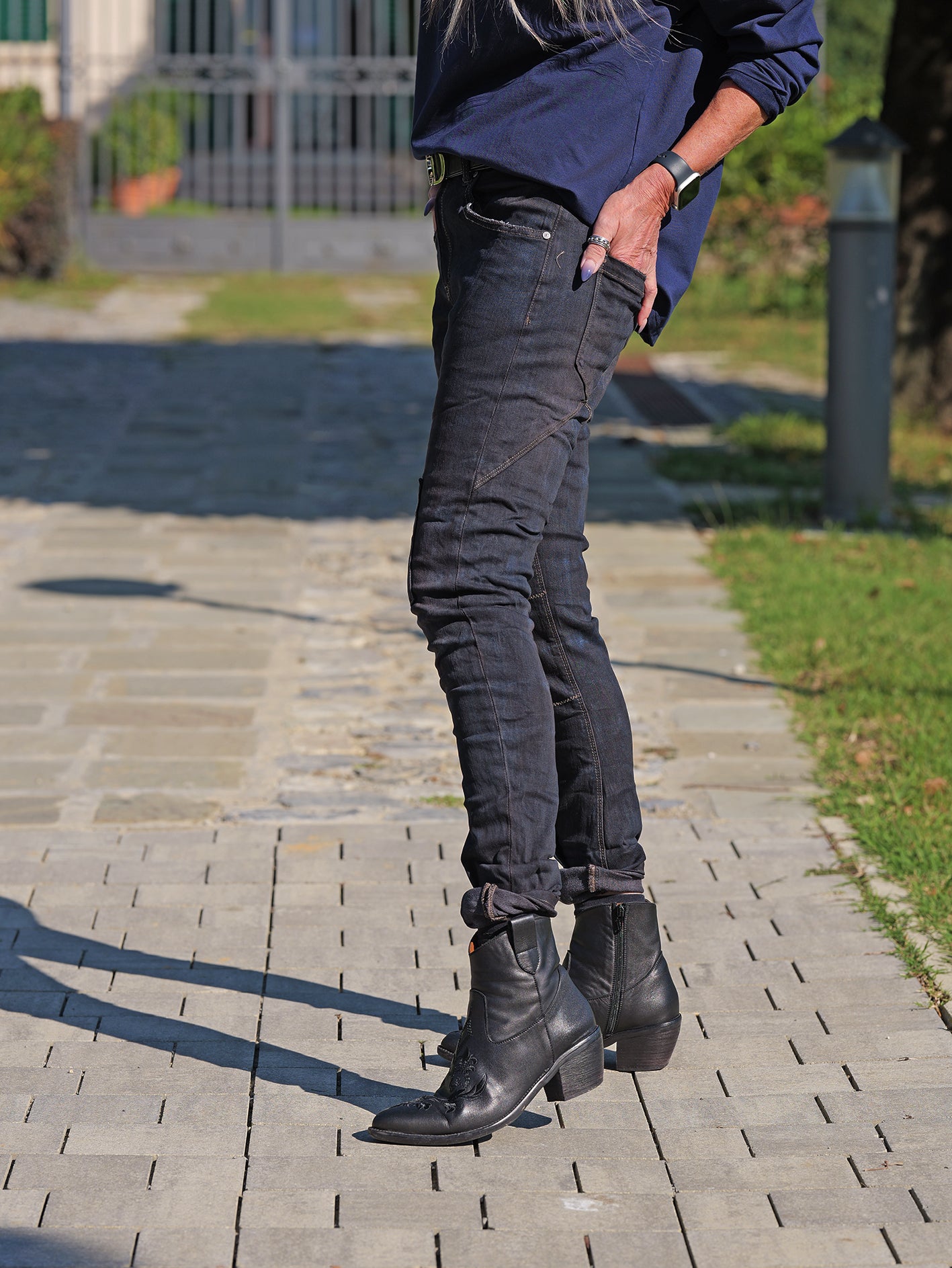 Kombiniere die Jeans Karin mit einem schlichten Shirt und Lederboots für einen coolen, urbanen Look – oder mit einer Bluse und Blazer für einen stylischen City-Auftritt.