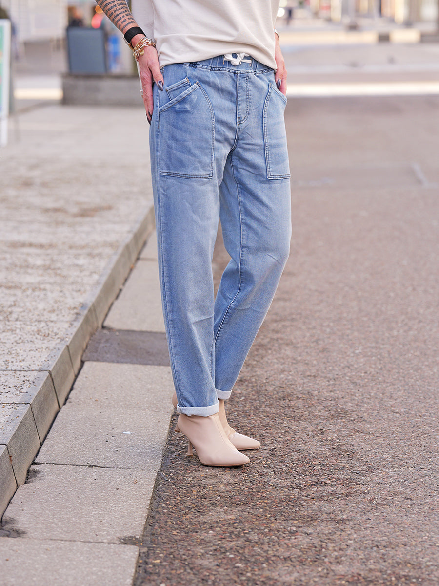 Die soften Materialien sorgen für ein besonders angenehmes Tragegefühl, während der elastische Bund mit Kordelzug den sportiven Charakter unterstreicht. Die aufgesetzten Taschen vorne geben der Jeans einen modernen, leicht Utility-inspirierten Look. Der schmal zulaufende Schnitt formt optisch eine schöne Silhouette, ohne einzuengen.