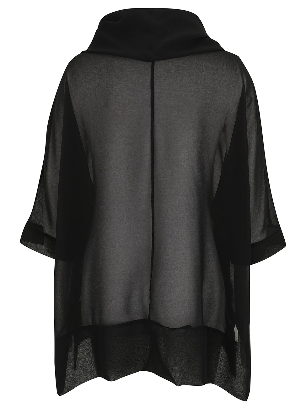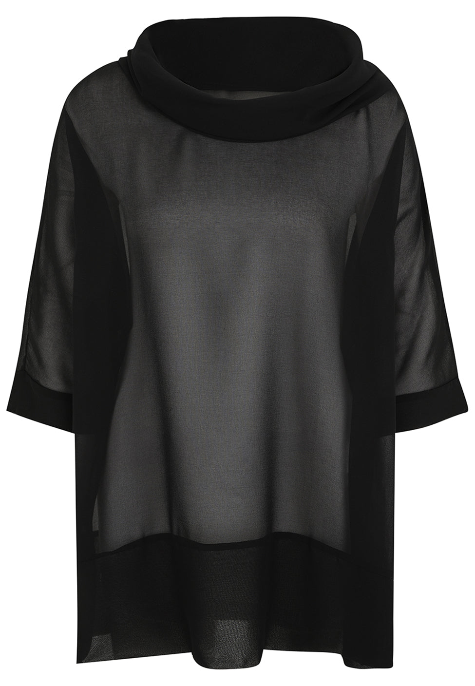 Diese edle halbtransparente Bluse von Doris Streich ist aus schwarzem Chiffon gefertigt. Der lässig feminine lockere Rollkragen und die breite Blende untem am Vorderteil und Rückenteil runden den edlen Look ab. Das Modell hat eine legere A-Linie mit