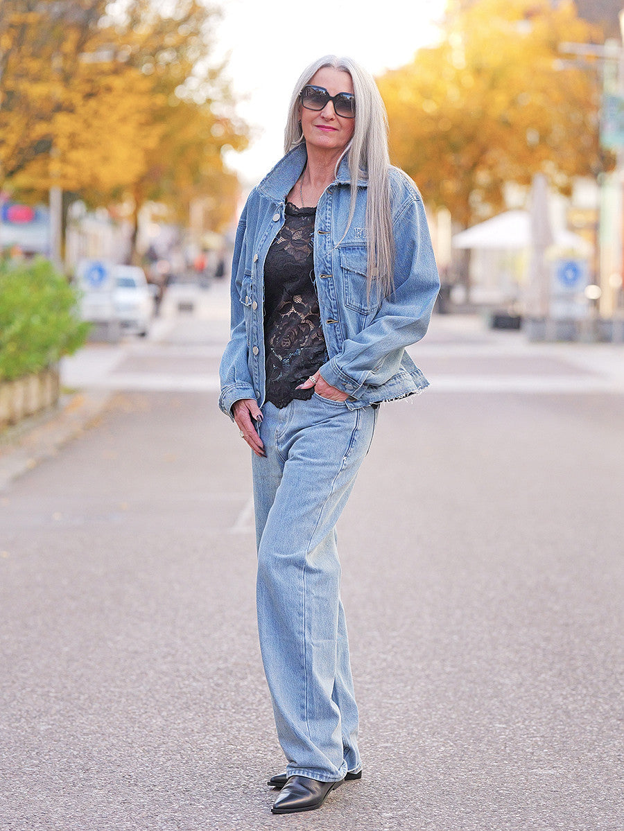 •  Styling-Tipp: Kombiniere die Chicago Jacket mit der passenden FDL Brooklyn Denim für den ultimativen Denim-on-Denim-Look oder setze sie als Statement-Piece zu Kleidern oder schwarzen Hosen ein.