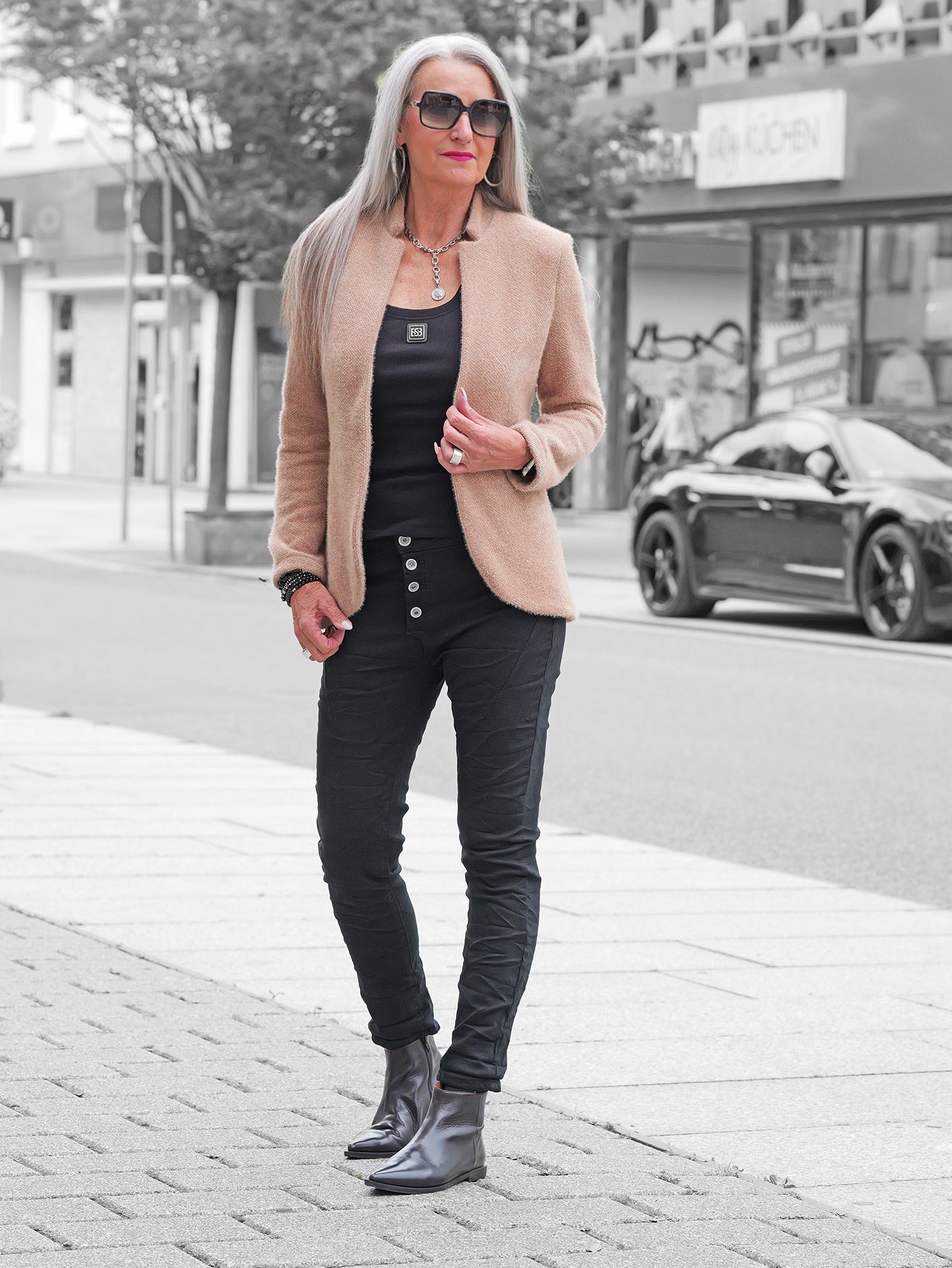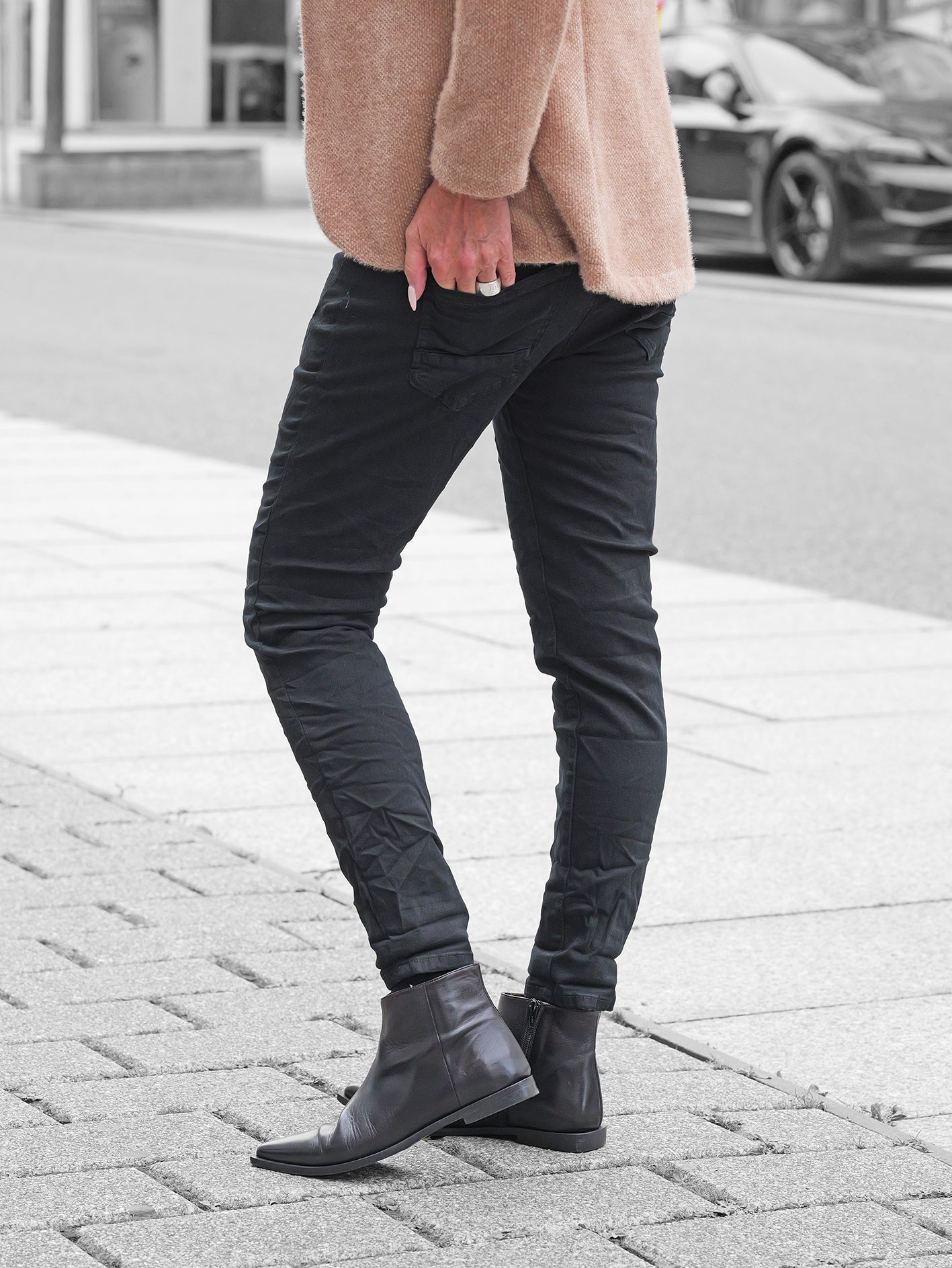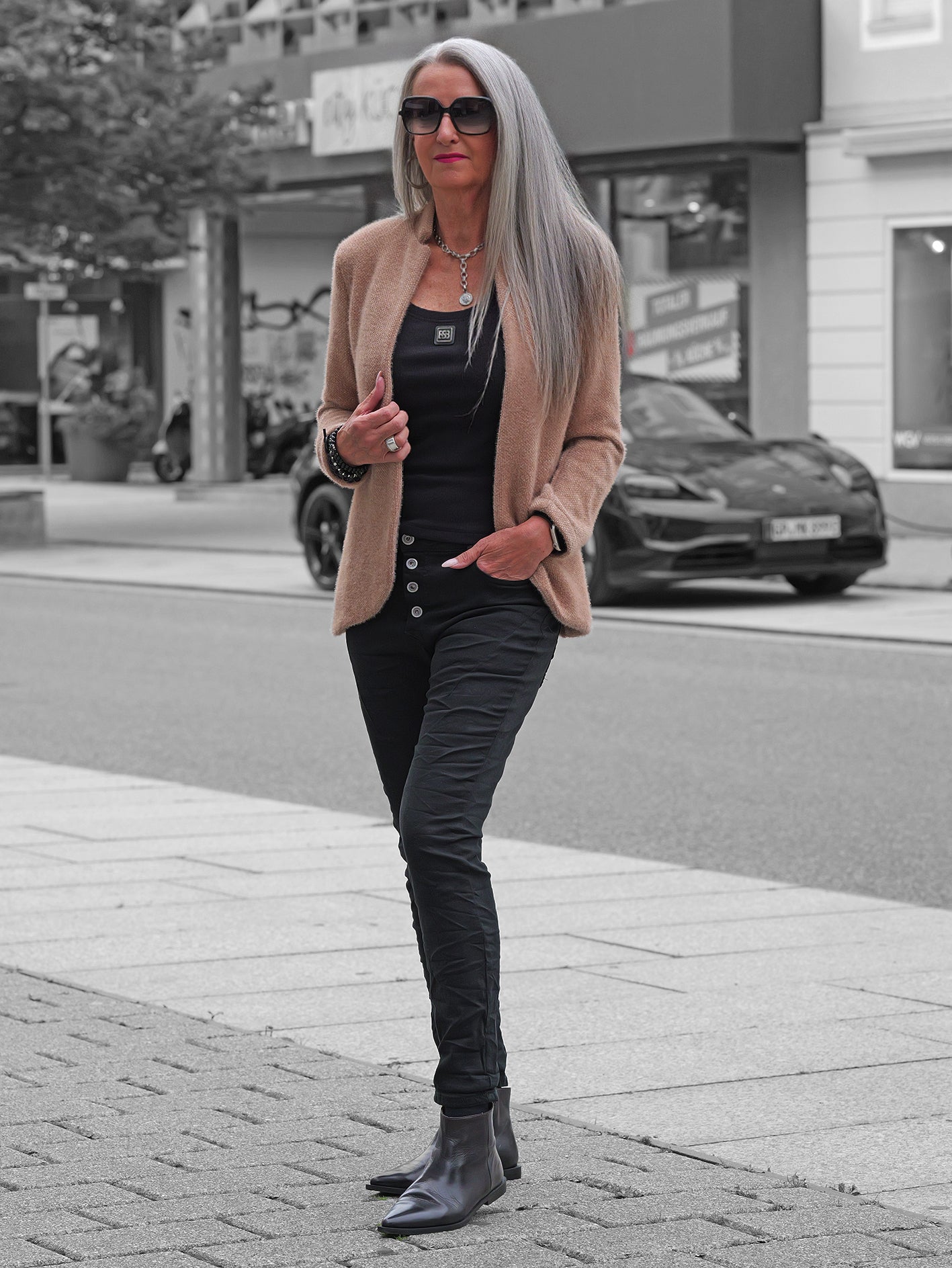 Unsere Imelda ist die perfekte Kombination aus cooler Denim-Optik und angenehmem Tragekomfort. Die moderne Slim-Fit-Passform betont die Figur, während das leichte Stretch-Material für Bewegungsfreiheit sorgt.