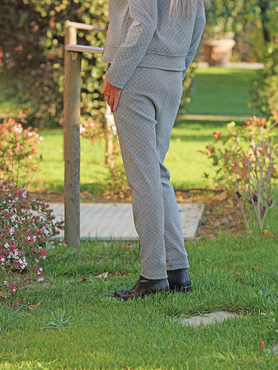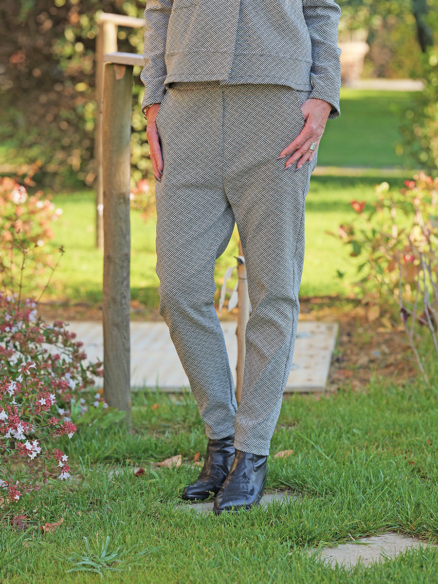 Die Hose Lina ist ein stilvoller Allrounder für Alltag und Business. Das feine, grafische Muster sorgt für einen modernen Look, während der elastische Bund und der weiche Viskose-Mix für ein angenehmes Tragegefühl sorgen. Der schmale Schnitt zaubert eine feminine Silhouette und lässt sich vielseitig kombinieren.