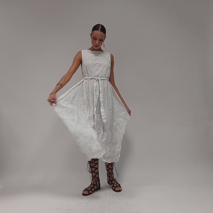 Der minimalistische Look wird durch raffinierte Details ergänzt: Die dezente V-Ausschnittlösung am Rücken setzt einen femininen Akzent, während die Bindeschärpe in der Taille variabel für Form sorgt. Ein feiner Knopf am Saum rundet das Design stilvoll ab. Ob pur getragen oder individuell gestylt – dieses Kleid steht für zeitlose Leichtigkeit mit avantgardistischem Anspruch.