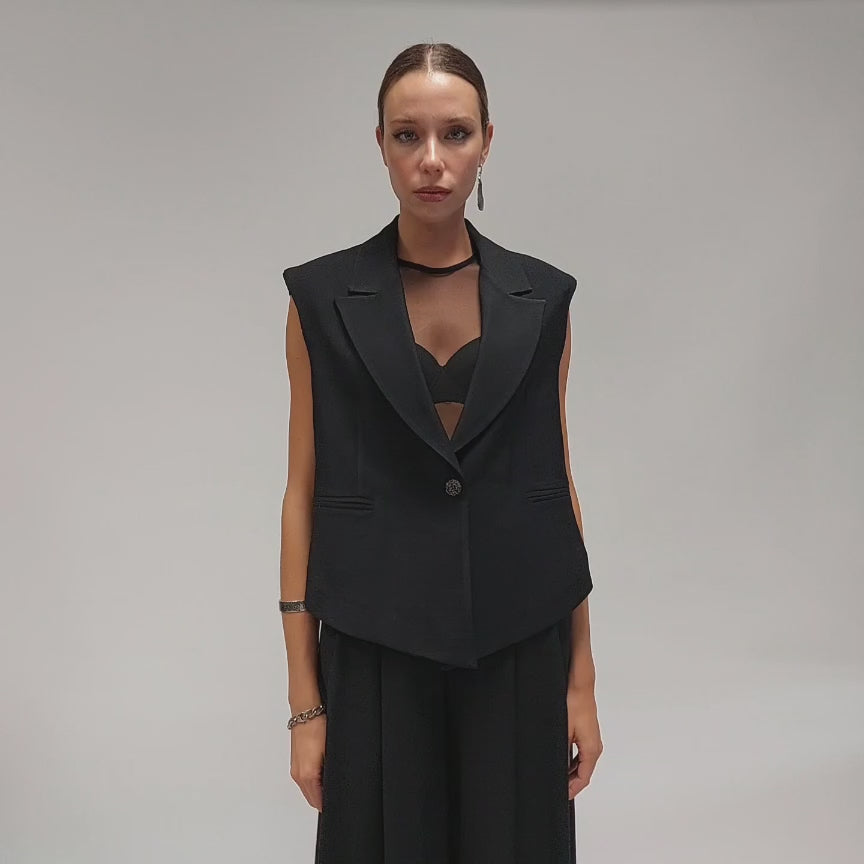 Das Gilet ist vollständig gefüttert und verfügt über dezente, innenliegende Schulterpolster, die dem Look Struktur und eine elegante Haltung verleihen. Der klassische Reverskragen sowie der Ein-Knopf-Verschluss unterstreichen den puristischen Charakter des Designs.
