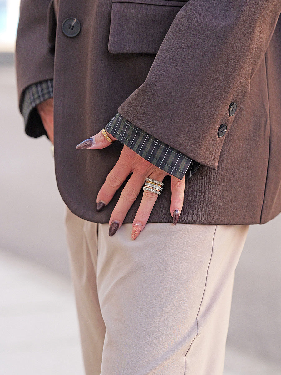 Ein besonderes Detail: Die Ärmelmanschetten lassen sich nach innen stülpen – so kann der Look ganz nach Wunsch klassisch oder leger mit sichtbarem Innenfutter gestylt werden. Der gerade Schnitt, das längere Revers und die leicht strukturierte Oberfläche verleihen dem Blazer eine edle, moderne Note.