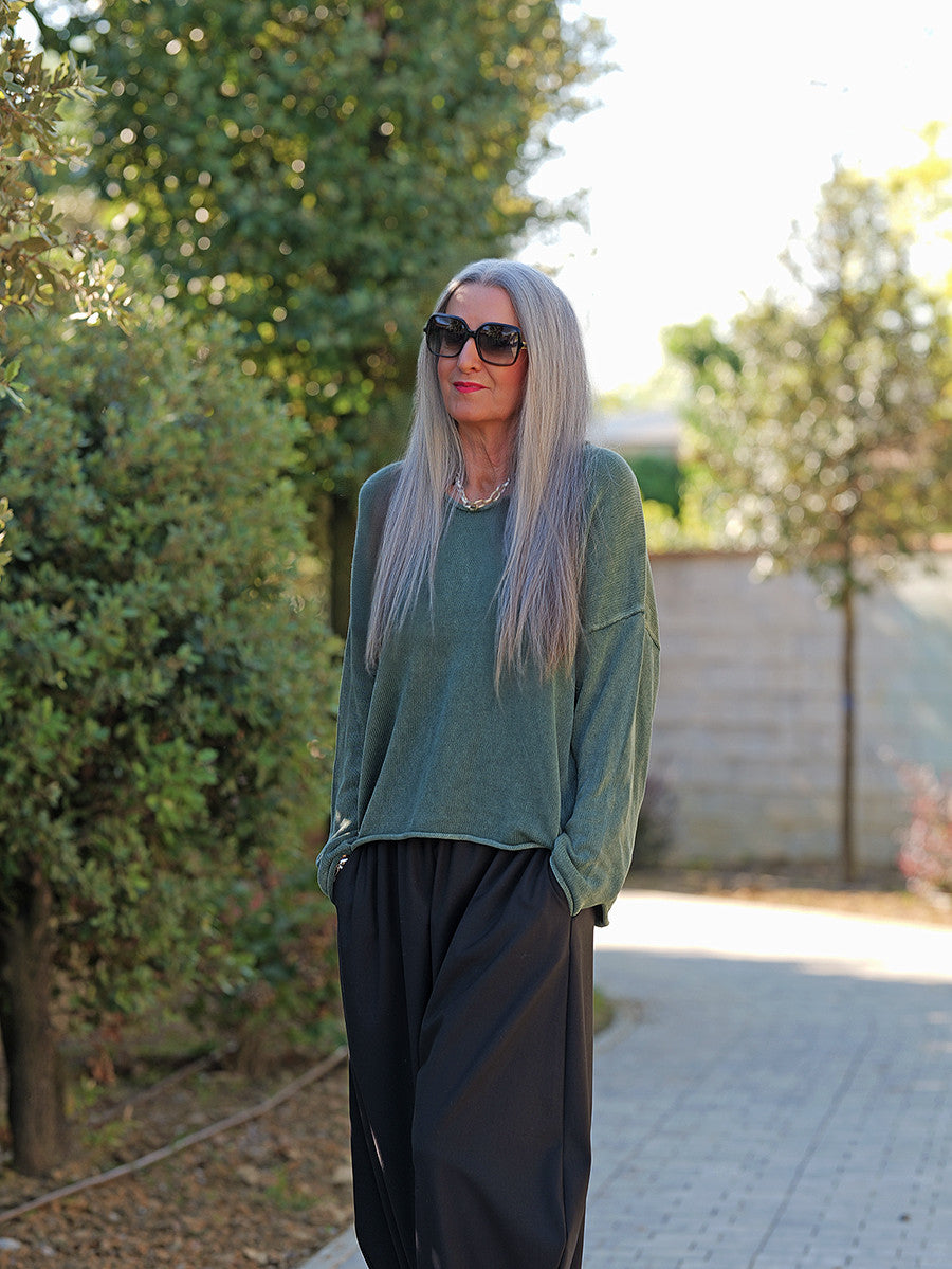 Unser Pullover Abby ist ein lässiges Must-have für entspannte, feminine Looks. Das weiche Baumwollmaterial liegt angenehm auf der Haut und sorgt für ein natürliches, atmungsaktives Tragegefühl. Durch den weiten, leicht kastigen Schnitt fällt der Pulli locker und schmeichelt der Figur. Besonders schön: der weite Rundhalsausschnitt, der sich auch off-shoulder tragen lässt – für eine moderne, unaufgeregte Silhouette.