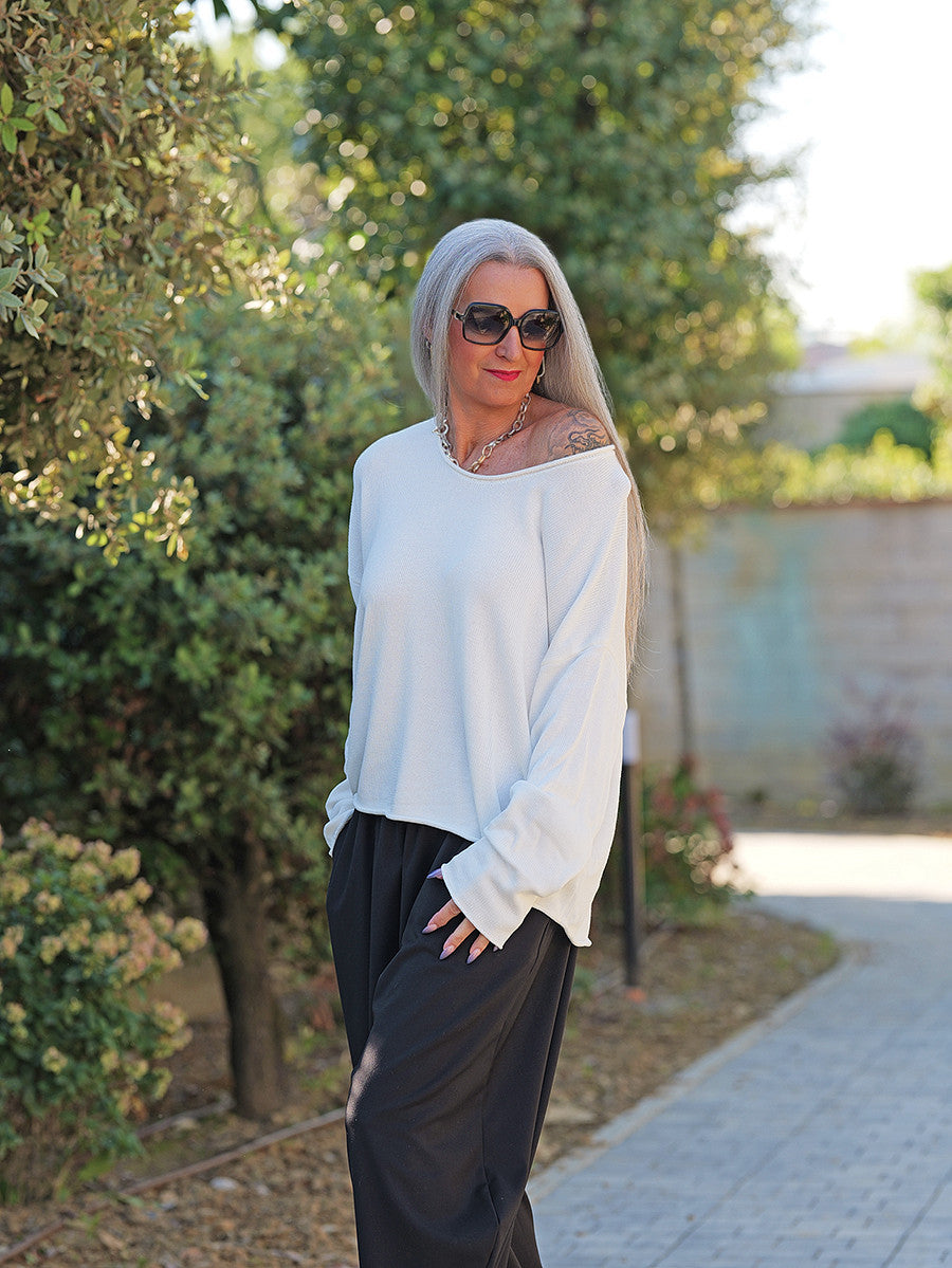 Unser Pullover Abby ist ein lässiges Must-have für entspannte, feminine Looks. Das weiche Baumwollmaterial liegt angenehm auf der Haut und sorgt für ein natürliches, atmungsaktives Tragegefühl. Durch den weiten, leicht kastigen Schnitt fällt der Pulli locker und schmeichelt der Figur. Besonders schön: der weite Rundhalsausschnitt, der sich auch off-shoulder tragen lässt – für eine moderne, unaufgeregte Silhouette.