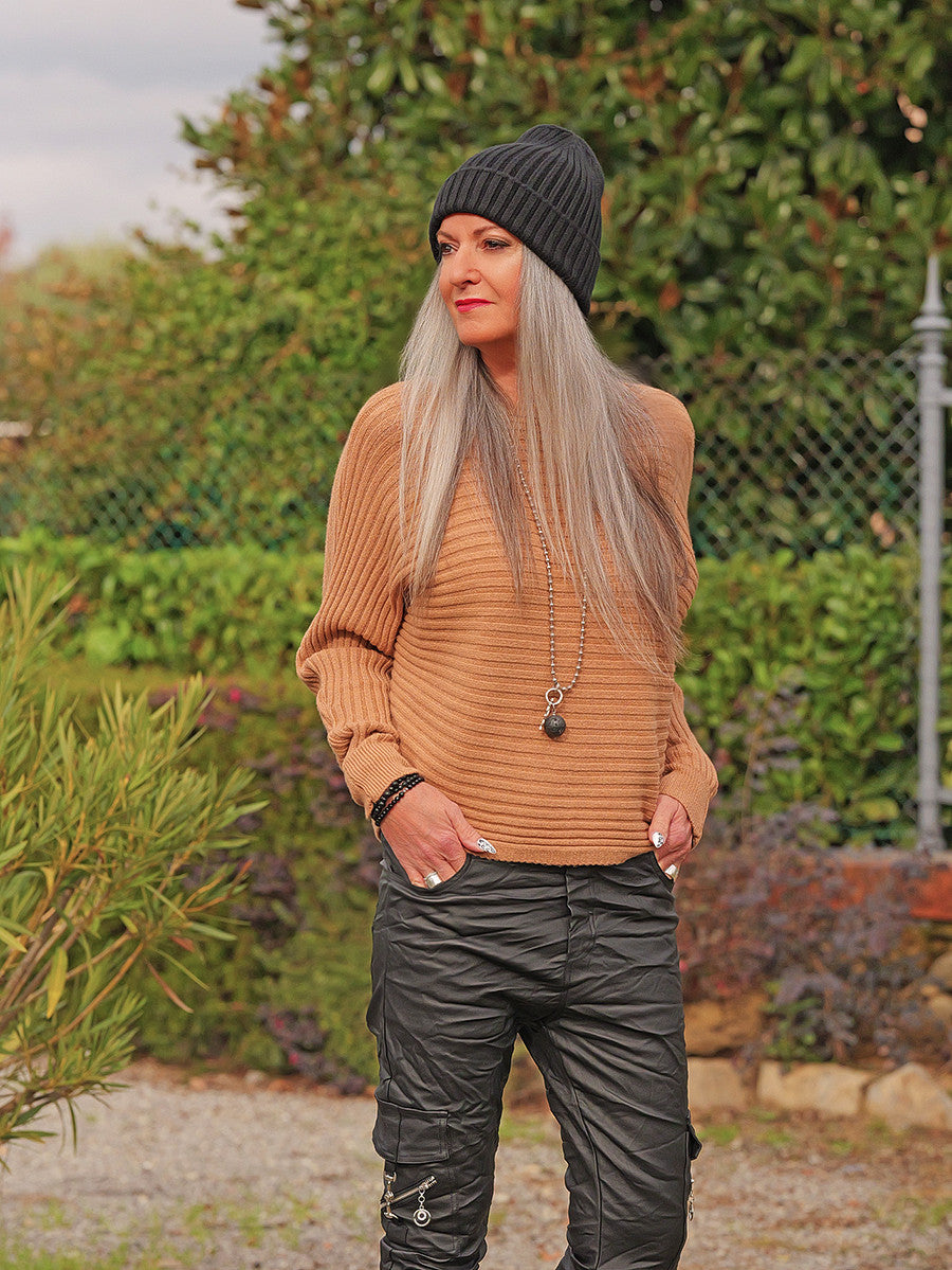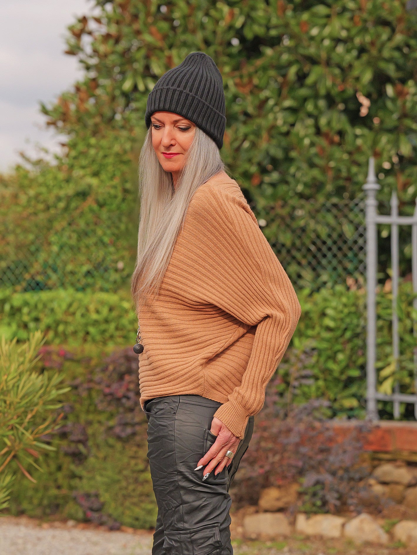 Der lockere, leicht verkürzte Schnitt sorgt für eine moderne Silhouette – perfekt zu High-Waist-Hosen, Denim oder Jogpants. Die fein gerippte Struktur verleiht dem Pullover zusätzlich Tiefe und einen edlen Look. Als Einheitsgröße passt Kara ideal bis Größe 40/42 und umschmeichelt dabei wunderbar die Figur.