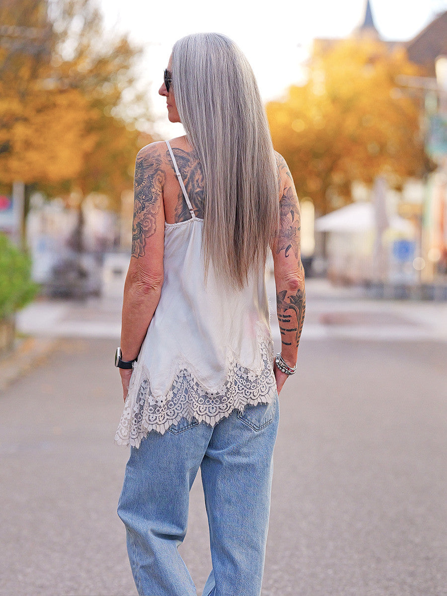 Unser Top Violetta verleiht jedem Outfit eine edle, feminine Note. Die feine Spitze am Saum und Dekolleté sorgt für einen eleganten Look, während die leichte Viskose ein angenehmes Tragegefühl bietet. Dank des luftigen Schnitts ist Violetta sowohl solo als auch unter Blazer, Strick oder Jacken ein echter Hingucker.