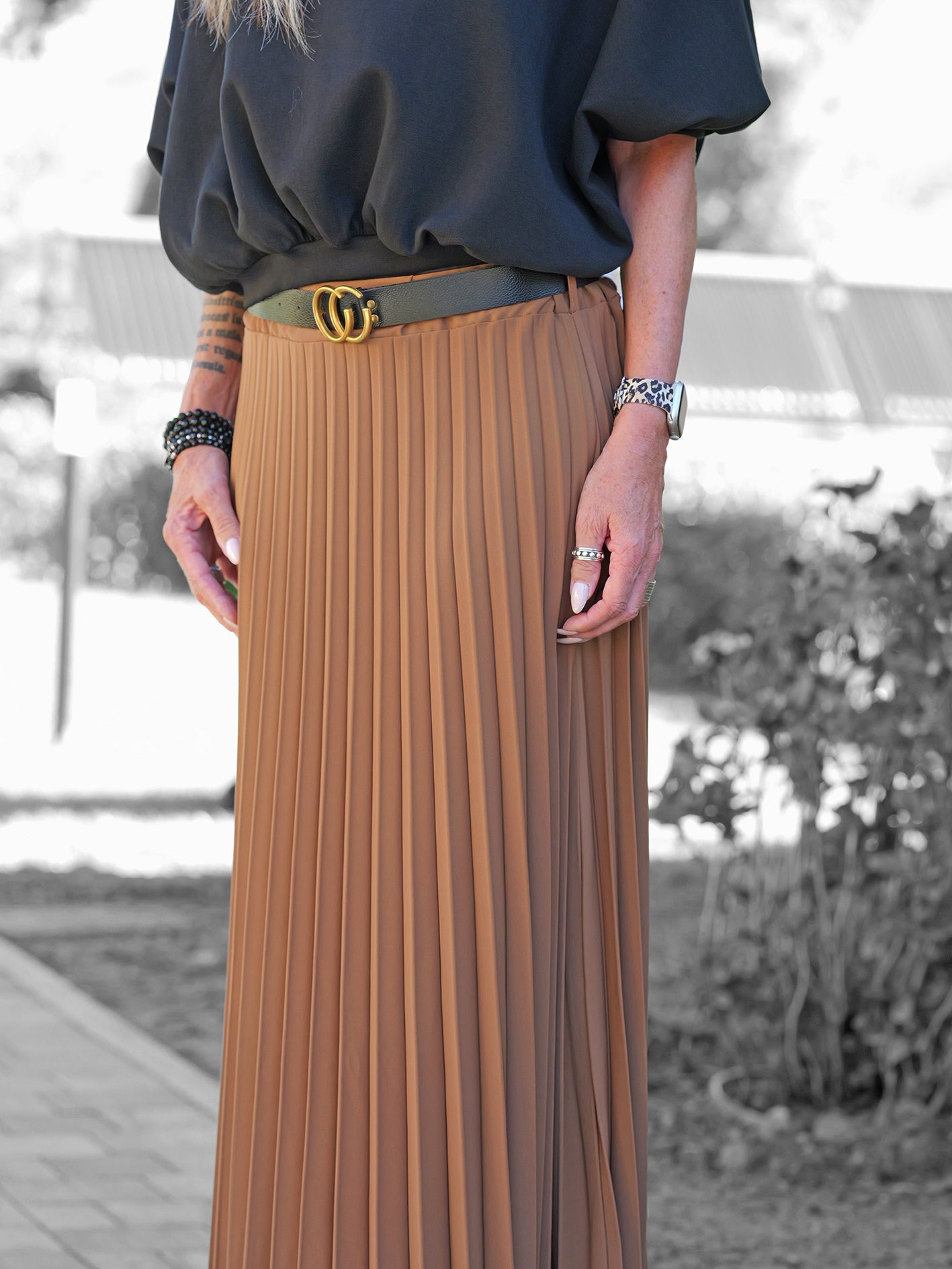 Ein Klassiker neu interpretiert: Dieser wunderschöne Plissee-Rock überzeugt durch seine fließende Silhouette und die feinen Falten, die jedem Outfit Bewegung und Eleganz verleihen.