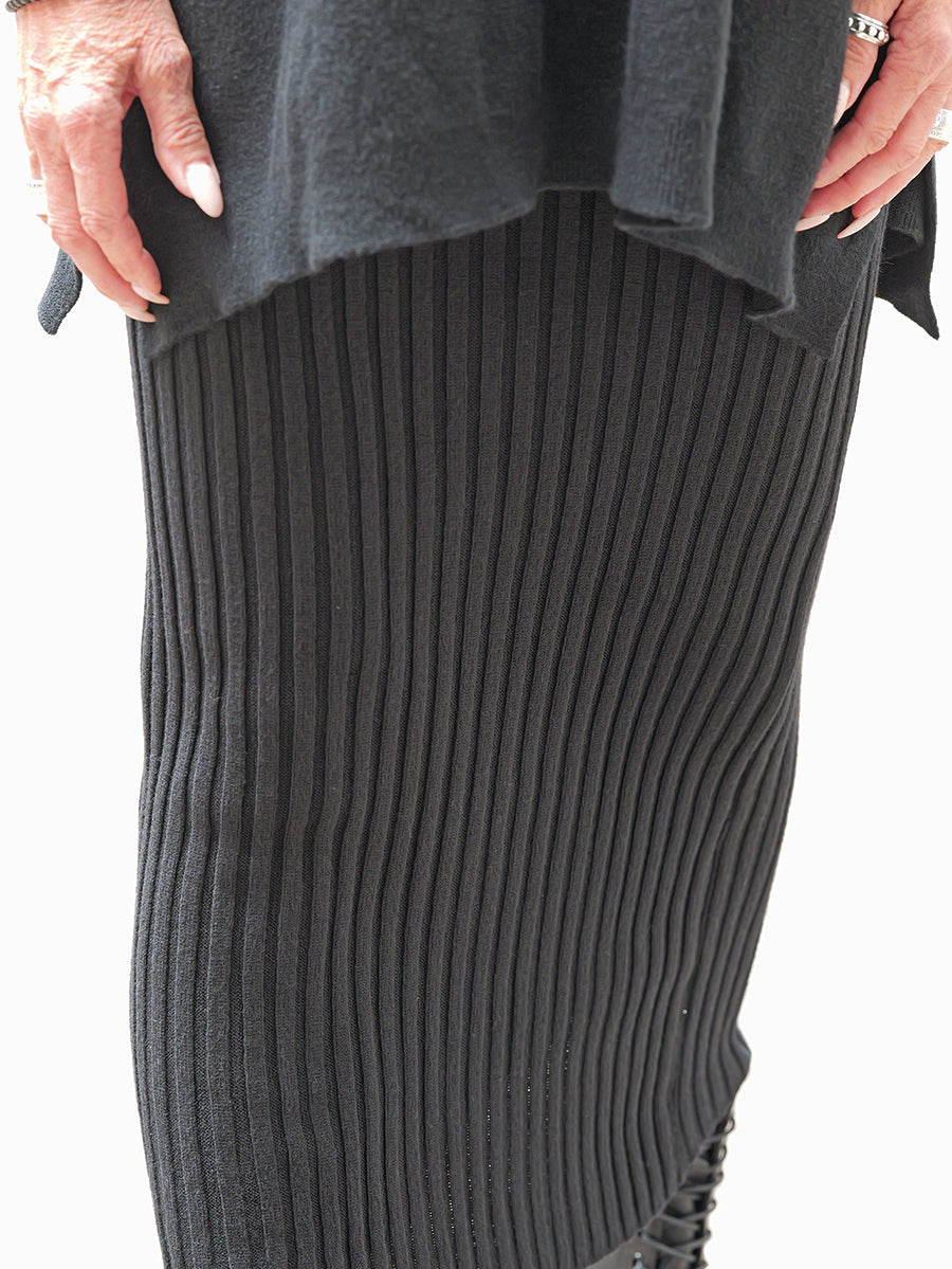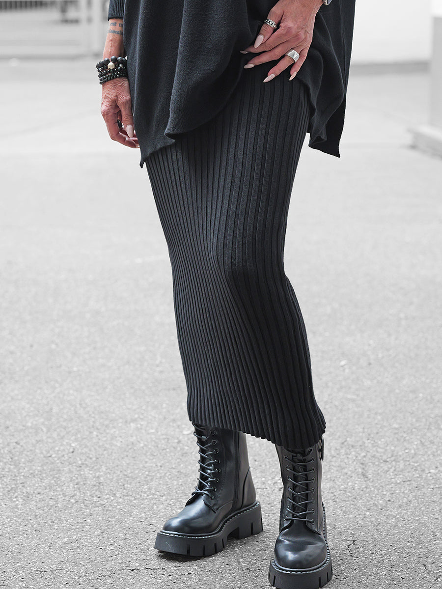 Das fein gerippte Strickdesign sorgt für eine schlanke Silhouette, während die Midi-Länge den Rock zu einem vielseitigen Allrounder für Alltag und Freizeit macht. Ob casual mit Chunky Boots oder elegant mit Stiefeletten – Linda lässt sich mühelos kombinieren.