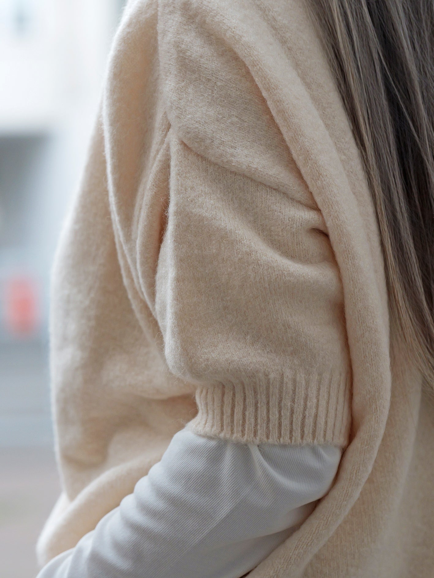 Der Materialmix aus 37 % Polyamid, 35 % Acryl, 25 % Alpaka und 3 % Elasthan sorgt für ein kuscheliges Tragegefühl bei gleichzeitig angenehmer Leichtigkeit. Die kurzen Ärmel und das breite Rippbündchen unterstreichen den modernen, lässig-femininen Look.
