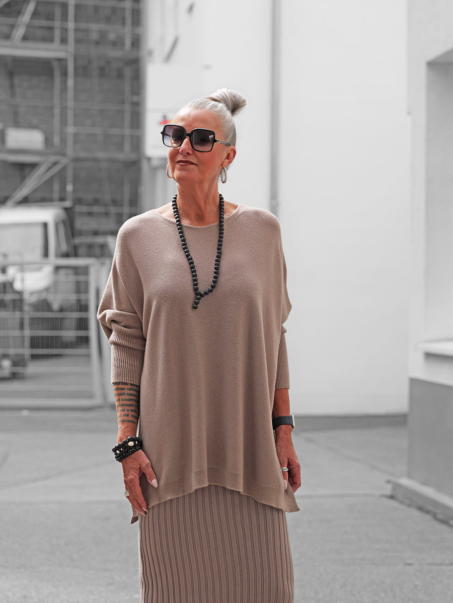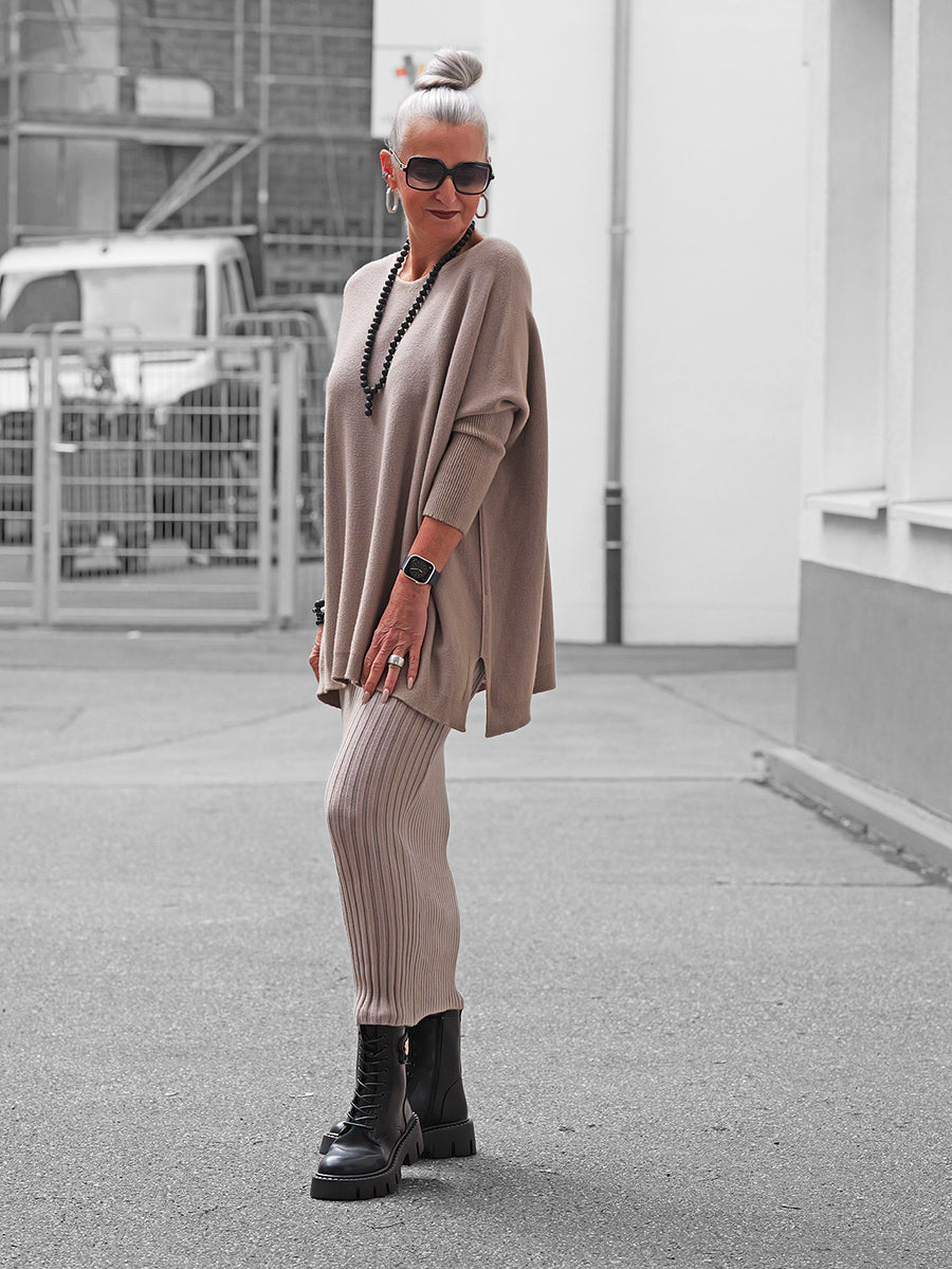 Styling-Tipp: Kombiniere Olivia mit einem Strickrock oder einer schmalen Hose und Boots für einen lässig-eleganten Look.