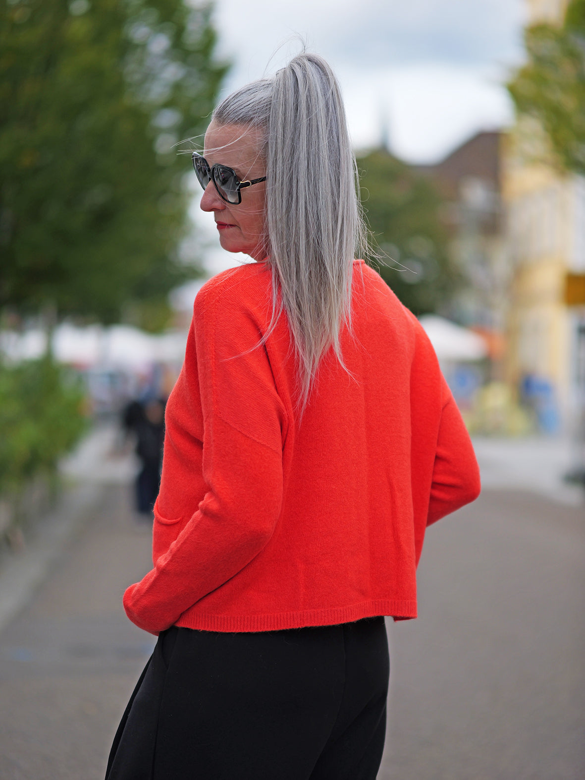 Kurzer Rundhals Pullover mit kleinen seitlichen Taschen