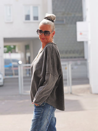 Penn&Ink Pulli grey: Grauer, langärmliger Pullover aus weichem, flauschigem Stoff mit V-Ausschnitt und entspannter Passform, kleines Etikett Designed in Brooklyn nahe dem Saum.