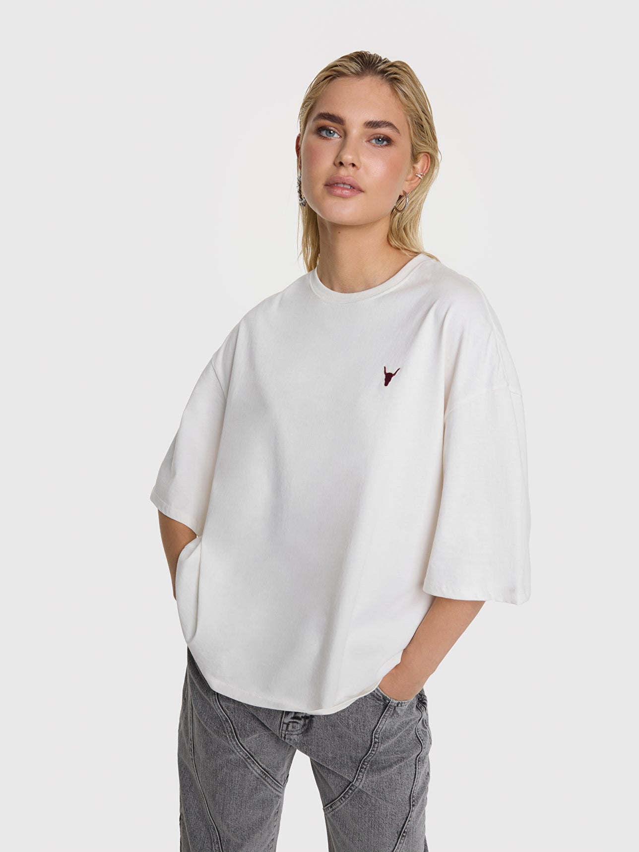 Auf der Vorderseite setzt ein kleines Stier-Motiv dezente Akzente, während das große „THE LABEL“-Logo auf der Rückseite für den markanten Streetstyle sorgt. Der klassische Rundhalsausschnitt mit Rippblende rundet den Look ab.