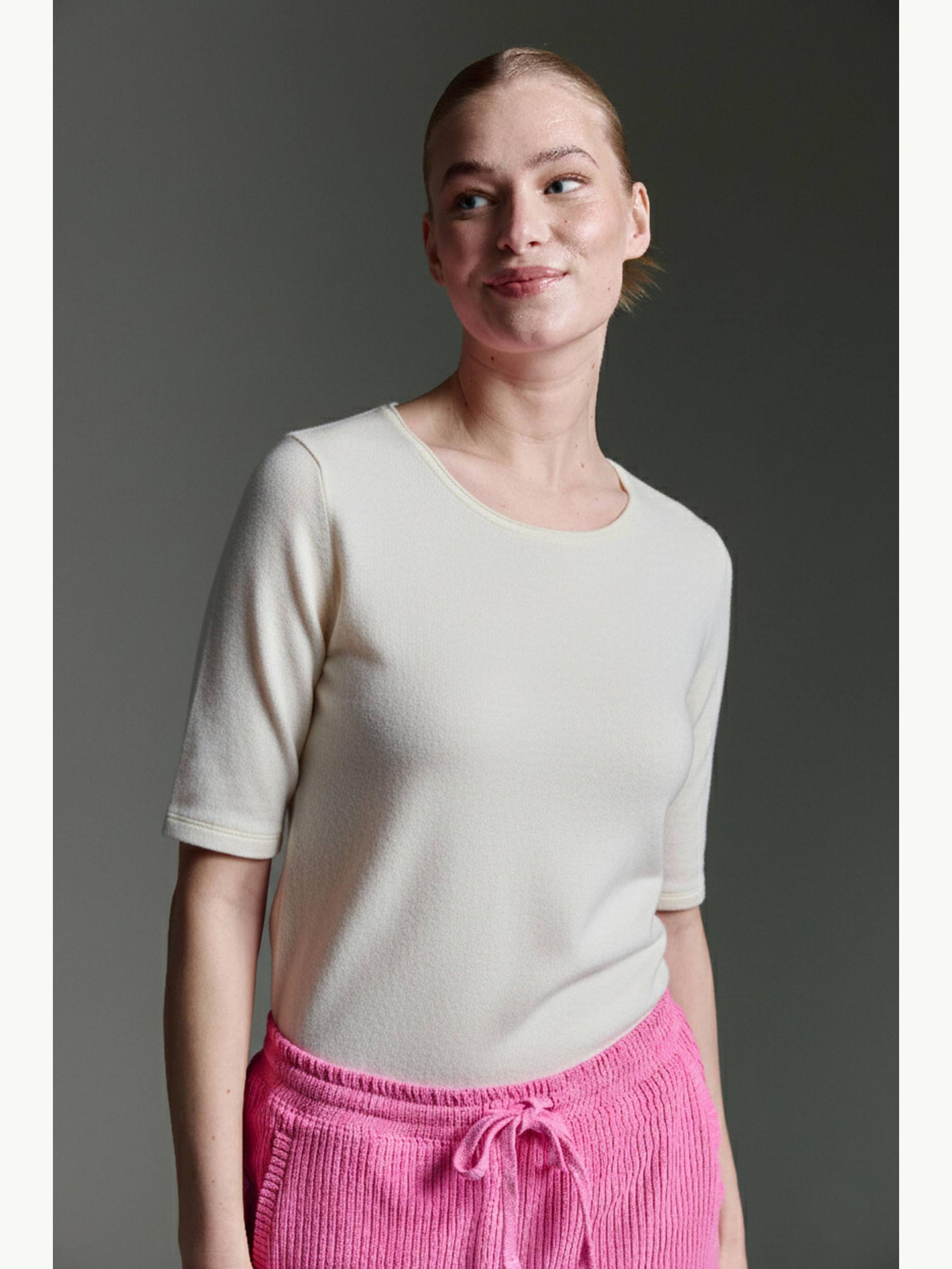 Ein vielseitiges Basic mit halblangem Ärmel und femininem Rundhalsausschnitt. Der angenehm weiche Stoff sorgt für höchsten Tragekomfort und eine schöne Passform. Dieses Modell lässt sich mühelos sowohl solo tragen als auch perfekt unter Jacken oder Cardigans kombinieren. Ideal für einen unkomplizierten und dennoch stilvollen Alltagslook.