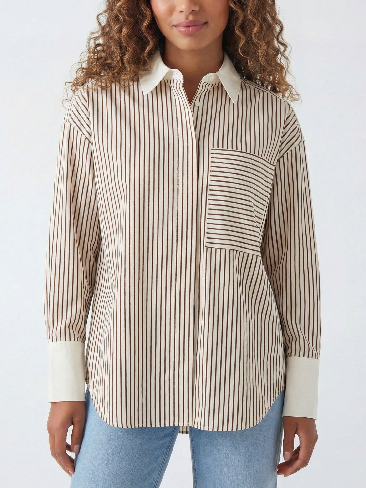 Besonders schön wirkt das Design durch die kontrastierenden Streifenrichtungen an der Brusttasche, die der Bluse eine besondere, modische Note verleihen. Der klassische Hemdkragen, die langen Ärmel mit breiten Manschetten und die leicht verlängerte Rückenpartie unterstreichen den hochwertigen Look.