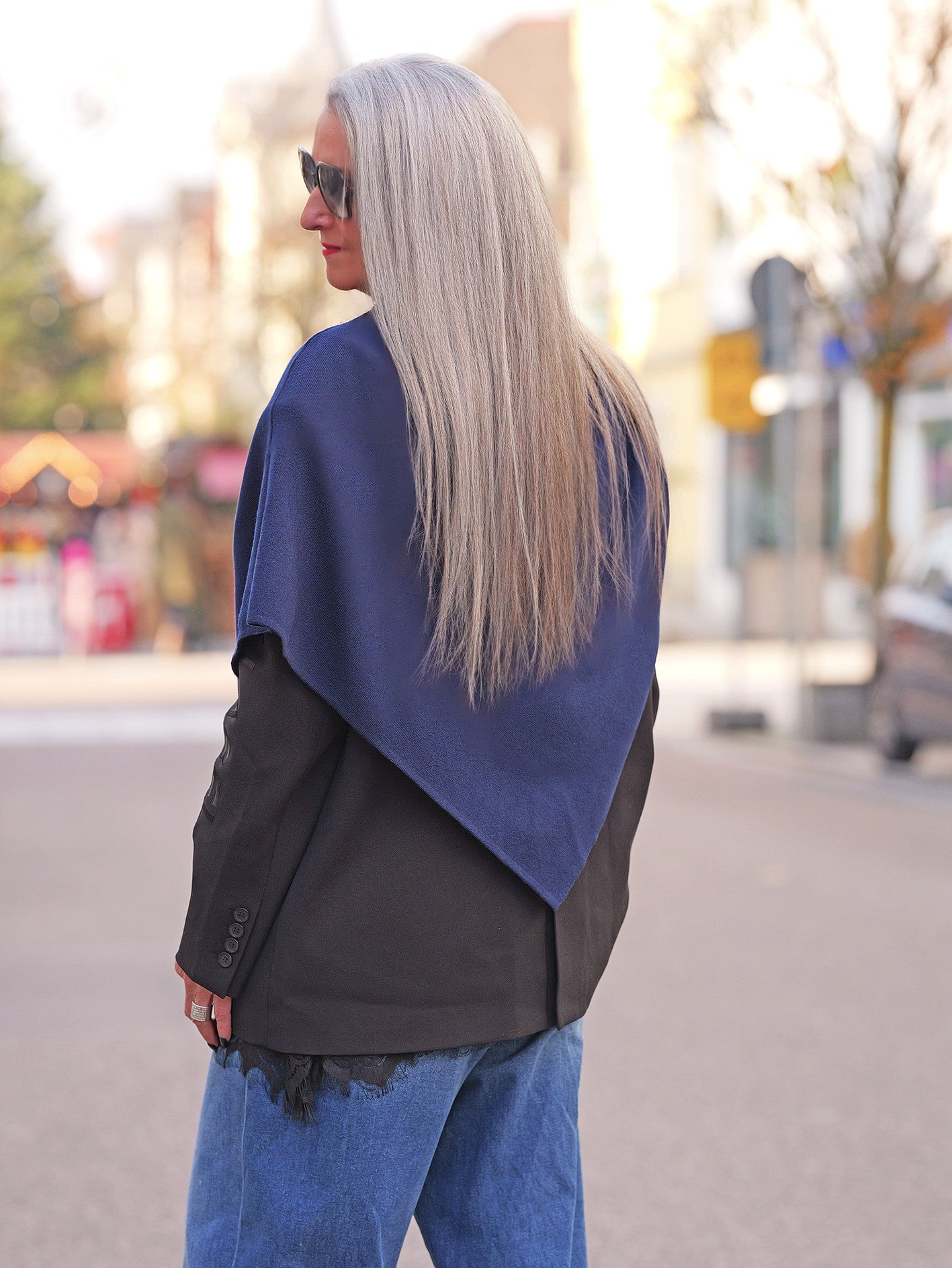 Die asymmetrische Form sorgt für einen modernen, fließenden Fall und lässt Lilli besonders elegant wirken – ob über einem Blazer, Strick, Shirt oder Kleid. Ideal für Übergangszeiten oder als stilvolles Accessoire für kühlere Tage.