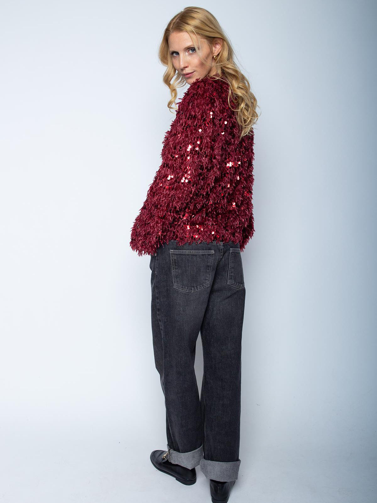 In fancy Wirkware mit Pailletten- und Federeffekt gefüttert