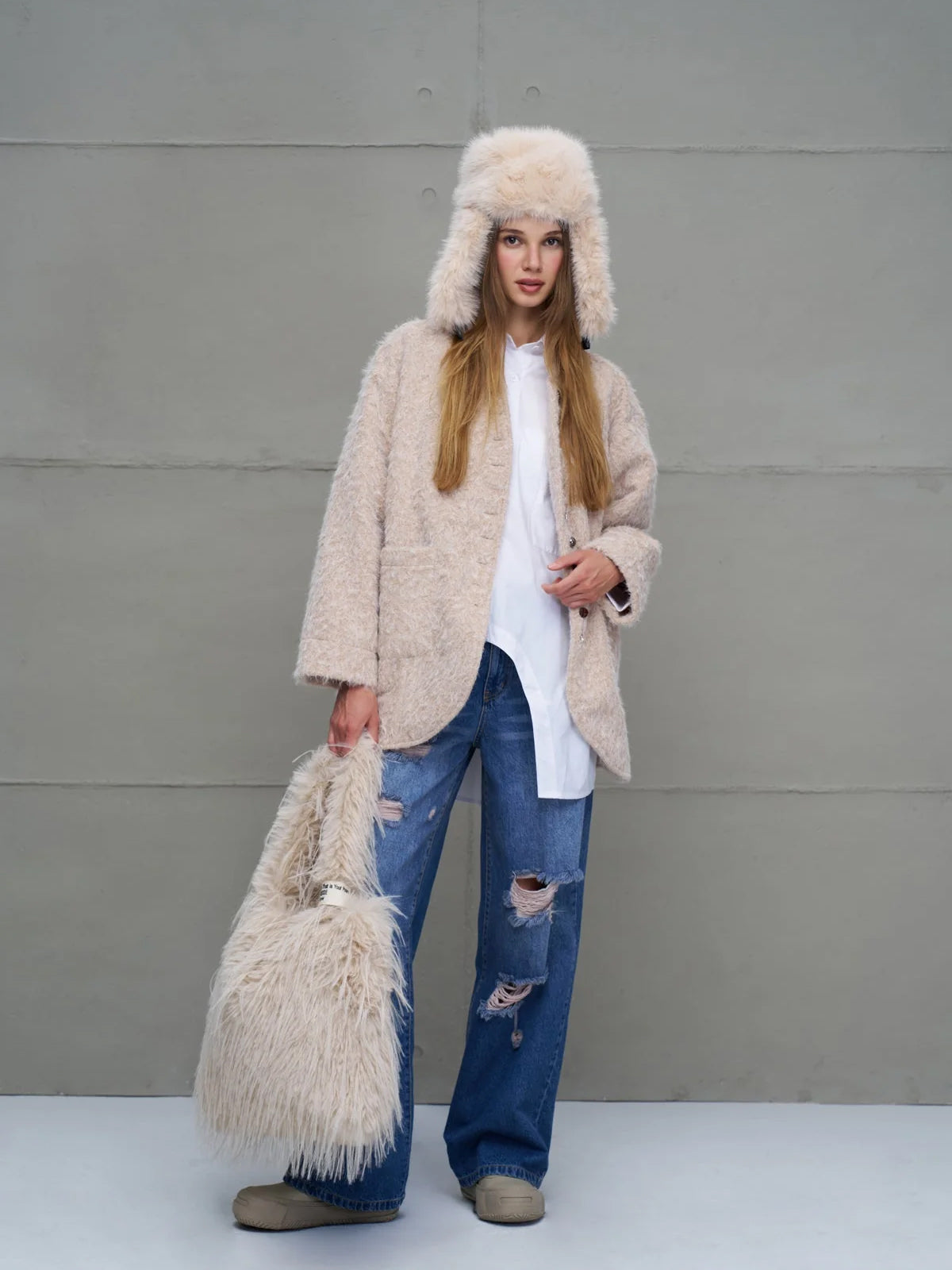 Stylisch durch die kalte Jahreszeit: Die Beige Faux Fur Earmuff Hat Pan von #VDR Viadellerose ist ein echtes Statement-Piece für winterliche Looks. Gefertigt aus 100 % PES, überzeugt sie mit kuschelig-weichem Kunstfell und bietet optimalen Schutz vor Kälte.
