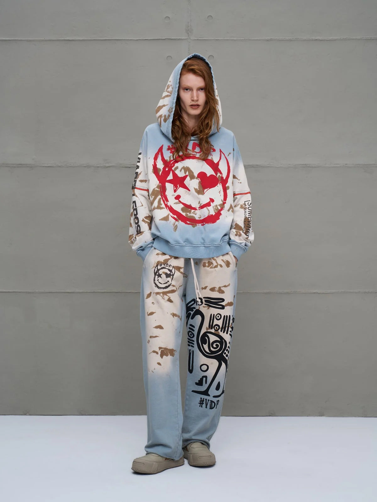 #VDR Blue Beige Distressed Print Oversized Trousers