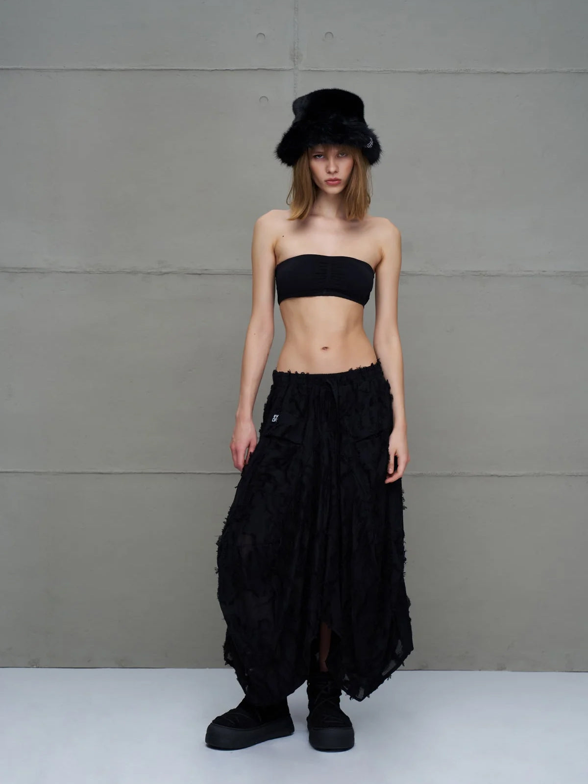 Der Tassel Midi Skirt von VDR ist ein echtes Statement-Piece, das durch seine asymmetrische Form und das halbtransparente Material besticht. Die leichte, fließende Qualität mit fransigen Details verleiht dem Rock eine moderne, verspielte Note, während der elastische Bund für Komfort und eine lässige Passform sorgt.