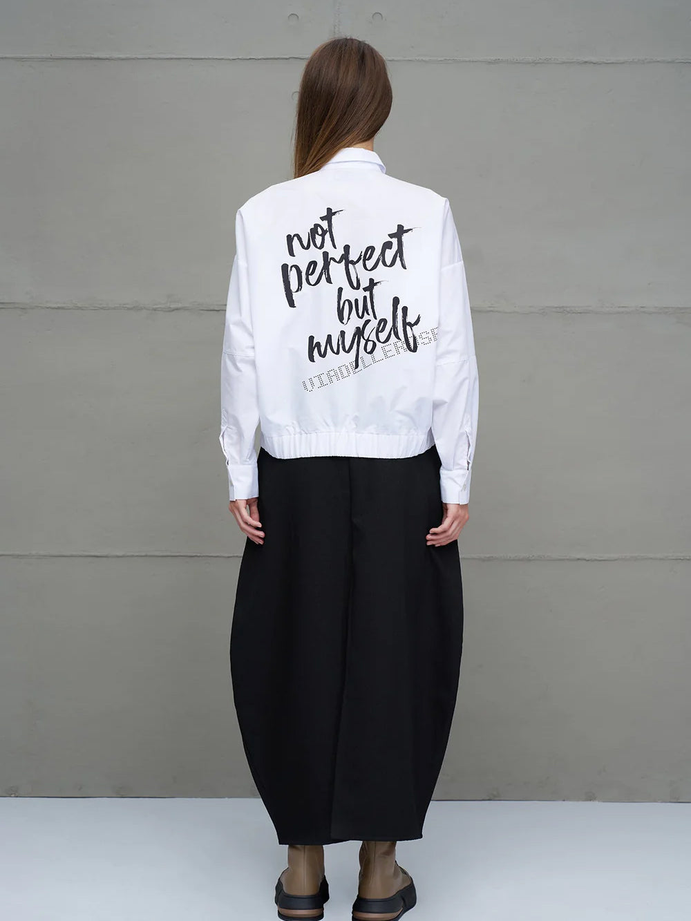 Ein moderner Klassiker mit starker Botschaft: Die weiße Langarmbluse von #VDR kombiniert cleanes Design mit lässigem Streetstyle. Der gerade, leicht verkürzte Schnitt und der elastische Bund verleihen ihr eine moderne Silhouette, während der auffällige Slogan-Print „Not Perfect But Myself“ auf der Rückseite für ein selbstbewusstes Fashion-Statement sorgt.